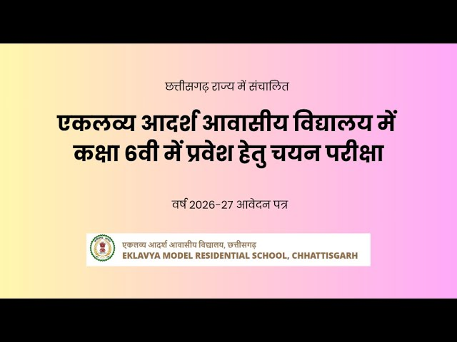 छत्तीसगढ़ राज्य स्तरीय आदिम जाति कल्याण एवं आश्रम शैक्षणिक संस्थान समिति द्वारा संचालित एकलव्य आदर्श आवासीय विद्यालयों में शिक्षण सत्र 2026-27 के लिए कक्षा 6वीं में प्रवेश प्राक्चयन परीक्षा के माध्यम से दिया जाना है। प्रवेश के लिए ऑनलाईन आवेदन एकलव्य विद्यालयों की विभागीय वेबसाइट के माध्यम से आमंत्रित किए जा रहे हैं। कक्षा 6वीं में प्रवेश के लिए प्राक्चयन परीक्षा का आयोजन 01 मार्च 2026 रविवार को प्रातः 10 बजे से 12 बजे तक किया जाएगा। ऑनलाईन आवेदन करने की प्रारंभ तिथि 08 जनवरी 2026 से 07 फरवरी 2026 तक निर्धारित है, जबकि ऑनलाईन भरे गए आवेदन पत्र में त्रुटि सुधार की अंतिम तिथि 08 फरवरी 2026 से 10 फरवरी 2026 तक रहेगी। उपरोक्तानुसार अधीनस्थ संचालित प्राथमिक शालाओं के प्रधान पाठकों को सूचित करेंगे।