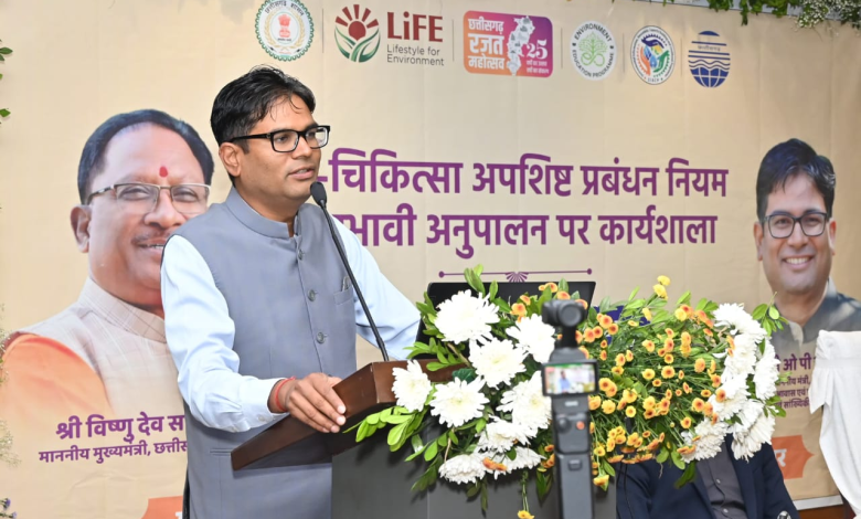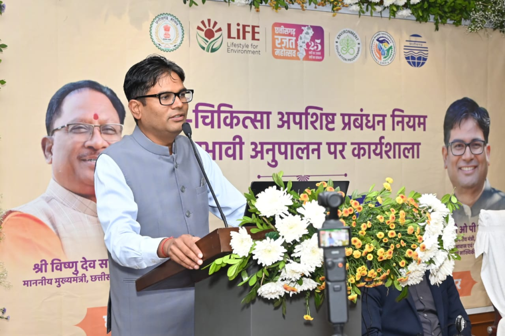 छत्तीसगढ़ पर्यावरण संरक्षण मण्डल द्वारा जैव चिकित्सा अपशिष्ट प्रबंधन नियम, 2016 (संशोधित 2021) के प्रभावी अनुपालन और जागरूकता बढ़ाने के उद्देश्य से आयोजित राज्य स्तरीय कार्यशाला का सफल आयोजन आज नवा रायपुर में हुआ। कार्यशाला के उद्घाटन सत्र में मुख्य अतिथि के रूप में उपस्थित वित्त, वाणिज्य कर, आवास एवं पर्यावरण तथा योजना एवं सांख्यिकी मंत्री श्री ओ.पी. चौधरी ने कहा कि जैव चिकित्सा अपशिष्ट का उचित प्रबंधन केवल स्वास्थ्य संस्थानों की नहीं बल्कि पूरे समाज की सामूहिक जिम्मेदारी है।