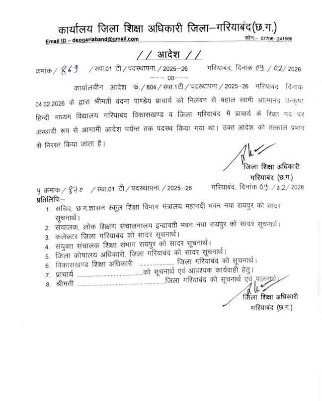 गरियाबंद के पीएम श्री स्वामी आत्मानंद हिंदी मीडियम स्कूल में विवादित प्राचार्य की पुनः पदस्थापना को लेकर बड़ा विवाद खड़ा हो गया। छात्रों, स्टाफ और प्रशासन के बीच यह मामला इतना बढ़ गया कि छात्रों को कलेक्टोरेट का घेराव करना पड़ा और अंततः प्रशासन को आदेश निरस्त करना पड़ा। पूरे मामले को विस्तार से समझिए—