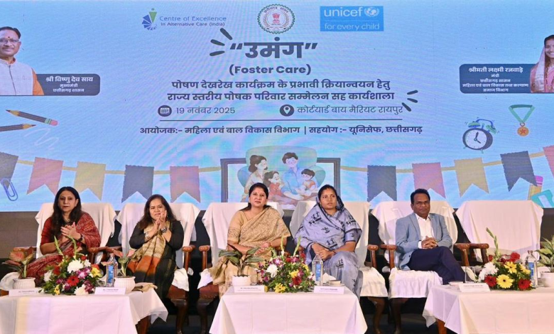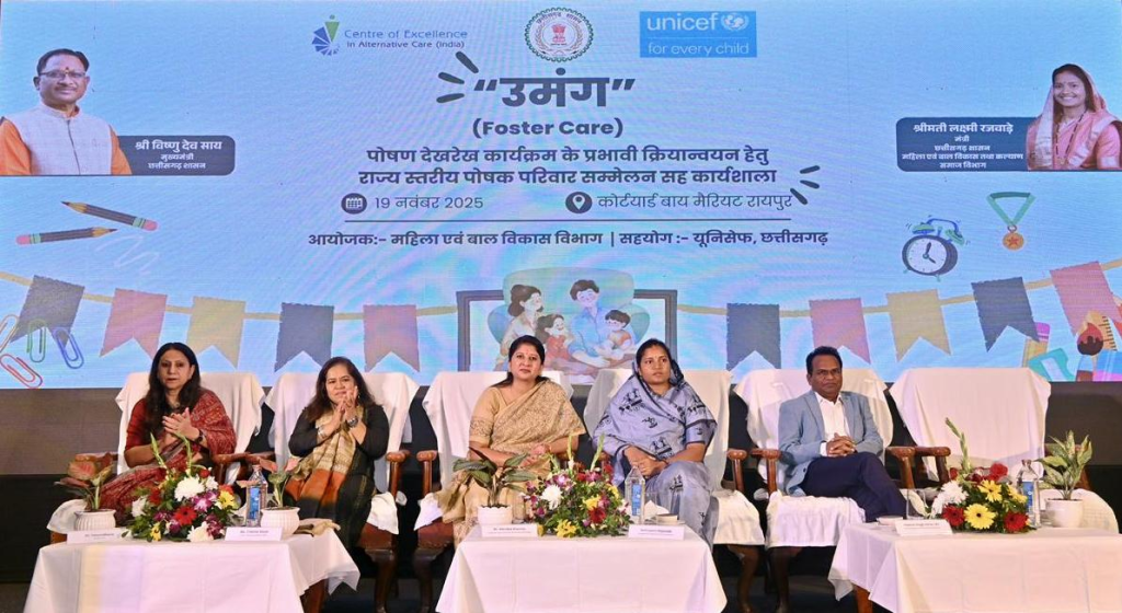 महिला एवं बाल विकास विभाग एवं यूनिसेफ के संयुक्त तत्वावधान में राजधानी रायपुर स्थित होटल मेरियट कोटयार्ड में “उमंग—पोषण देखरेख (Foster Care)” कार्यक्रम को सुदृढ़ बनाने हेतु राज्य स्तरीय पोषक परिवार सम्मेलन एवं कार्यशाला का सफल आयोजन किया गया। इस कार्यक्रम का उद्देश्य पोषण देखरेख व्यवस्था को अधिक प्रभावी, संवेदनशील और व्यापक बनाना था, ताकि संस्थागत देखरेख में रह रहे बच्चों को सुरक्षित, स्नेहपूर्ण और पारिवारिक वातावरण उपलब्ध कराया जा सके।